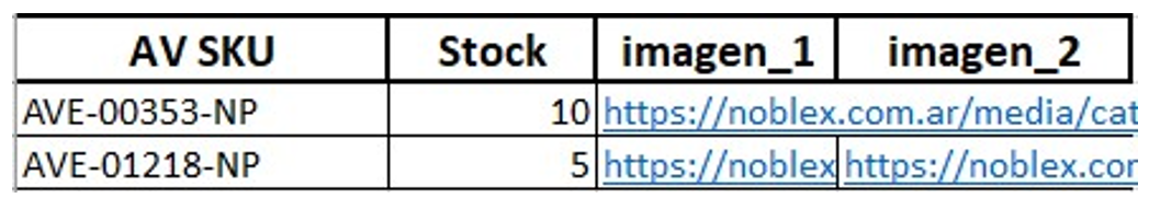 - Cargaremos los links de las imágenes en su respectiva columna. Es importante que la imagen sea de un dominio público, como puede ser su tienda web o un servidor propio, también deben verificar que el hipervínculo se enlace correctamente.