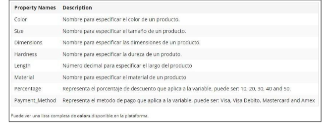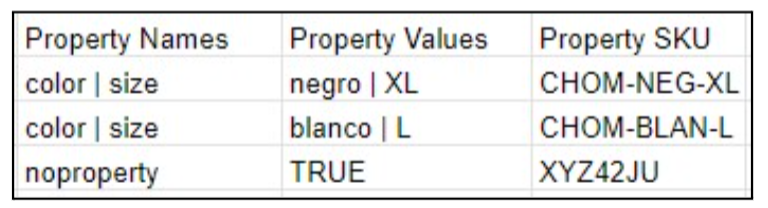 Nombre de la variante del producto, por ejemplo: color o size. Si se desea agregar más de una variante se deben separar por |. Si el producto no tiene variantes se debe poner “noproperty”. Las variantes se pueden ver en la pestaña de “Importar productos” de shopadmin.