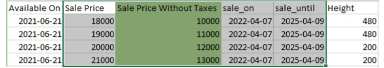 En caso de tener productos con oferta, se tiene que armarotro archivo con estos productos y agregar las siguientes columnas entre “Avalible On” y “Height”: