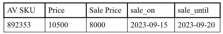 el de “Fecha de inicio de oferta” a “sale_on” y el de “Fecha de fin de oferta” a “sale_until”.